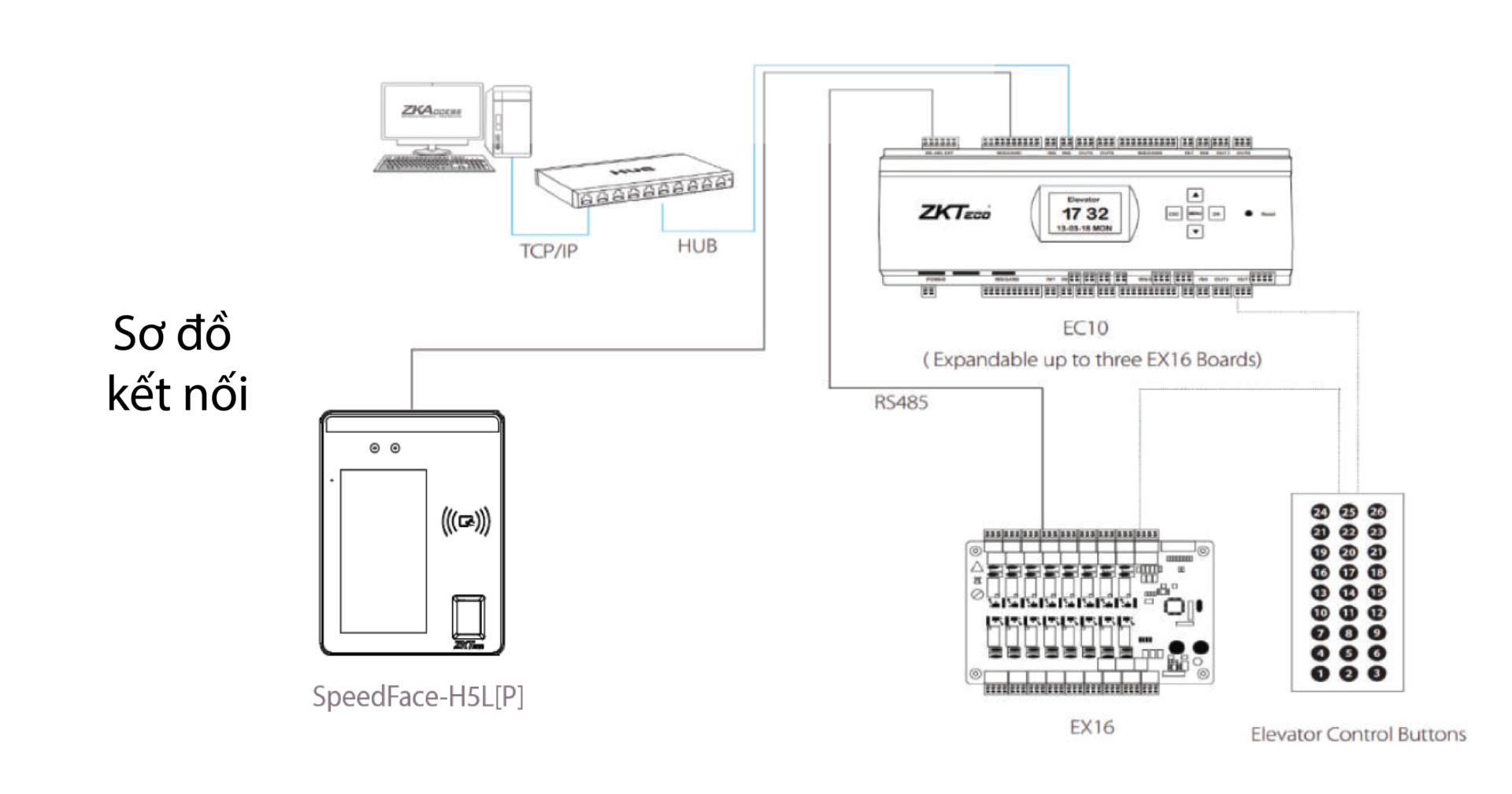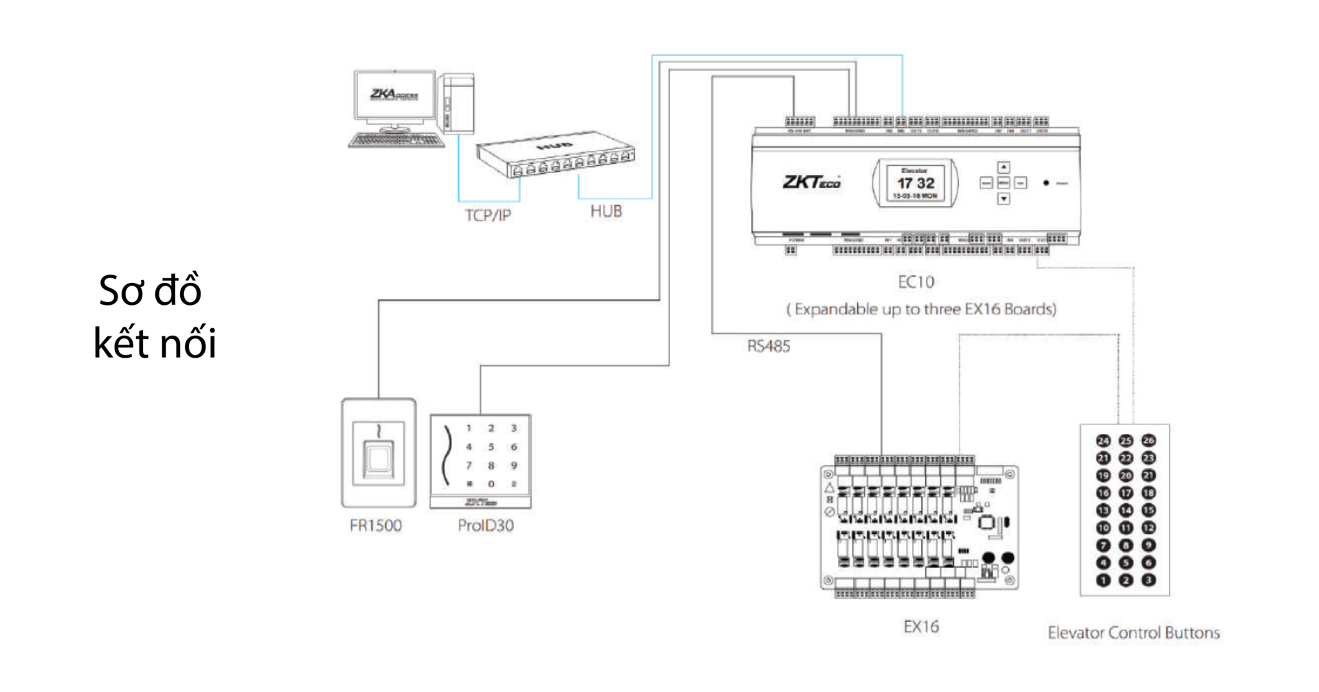 Khi kết nối tất cả với nhau, hệ thống kiểm soát thang máy ZKTeco cho phép điều khiển lên đến 58 tầng.