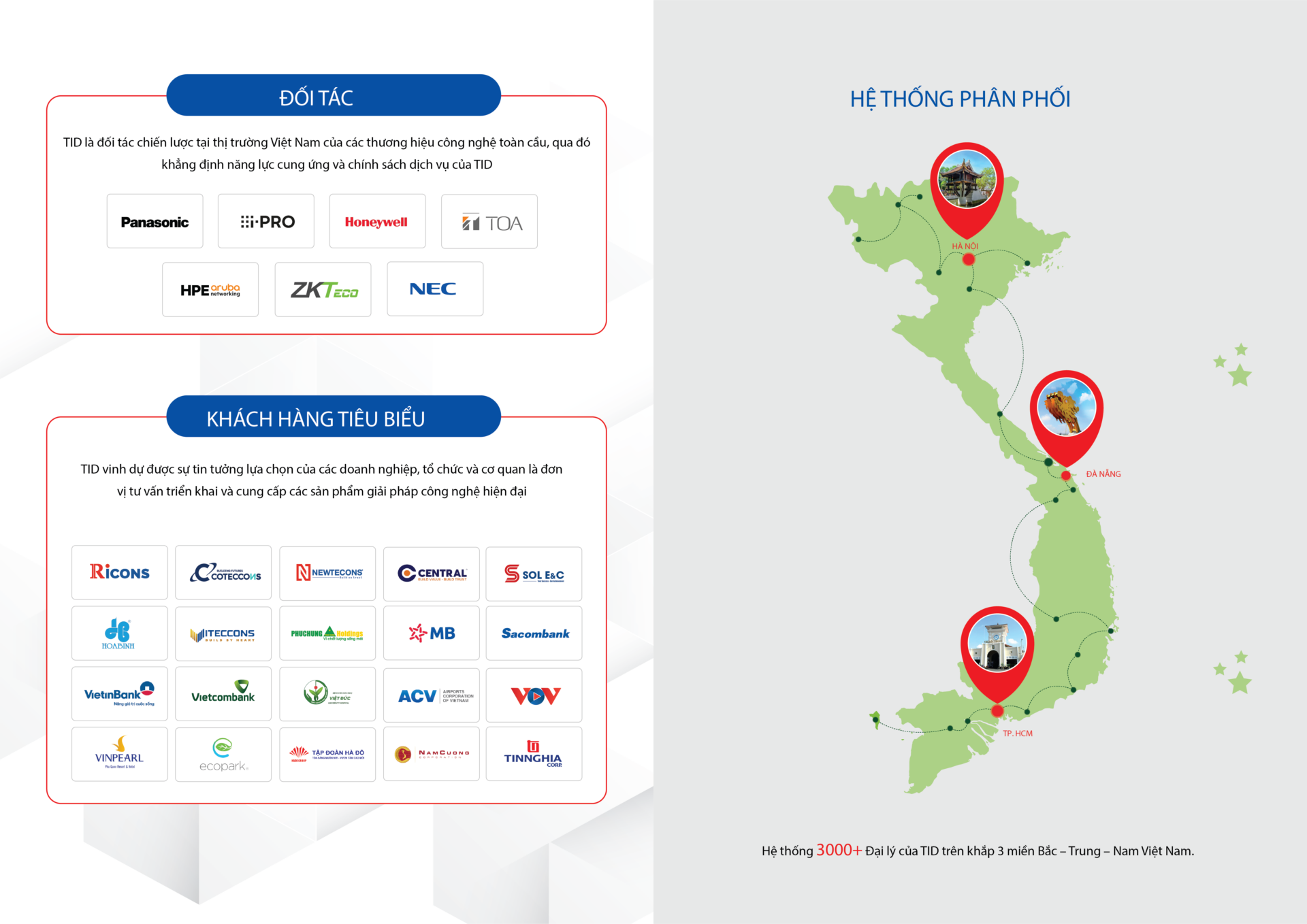 Đồng thời, TID tự hào khi có hệ thống Đại lý phân phối ở khắp 3 miền Bắc - Trung - Nam Việt Nam và được sự tin tưởng lựa chọn của các doanh nghiệp, tổ chức và cơ quan để trở thành đơn vị tư vấn thiết kế và cung cấp các sản phẩm giải pháp, hệ thống thiết bị an ninh - viễn thông công nghệ hiện đại.