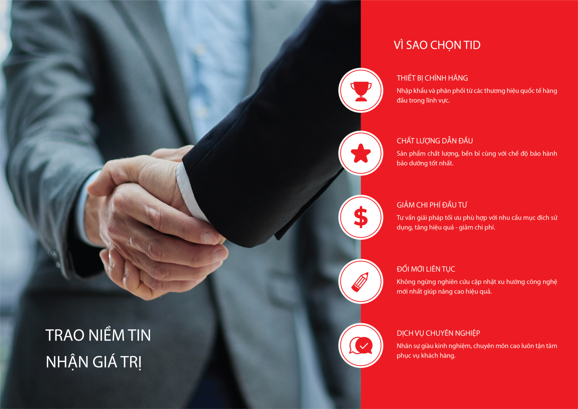 Trong suốt hơn 30 năm qua, TID luôn cam kết dịch vụ trước và sau bán hàng với tất cả Quý Khách hàng của mình. Dịch vụ trước bán hàng, chúng tôi có đội ngũ tư vấn sản phẩm - giải pháp, tư vấn thiết kế, đào tạo cho tất cả Quý Khách hàng, từ Khách hàng nhỏ đến Khách hàng lớn. Dịch vụ sau bán hàng, chúng tôi cam kết giao hàng tận nơi, bảo hành - bảo trì nhanh chóng cho tất cả Quý Khách hàng của mình.