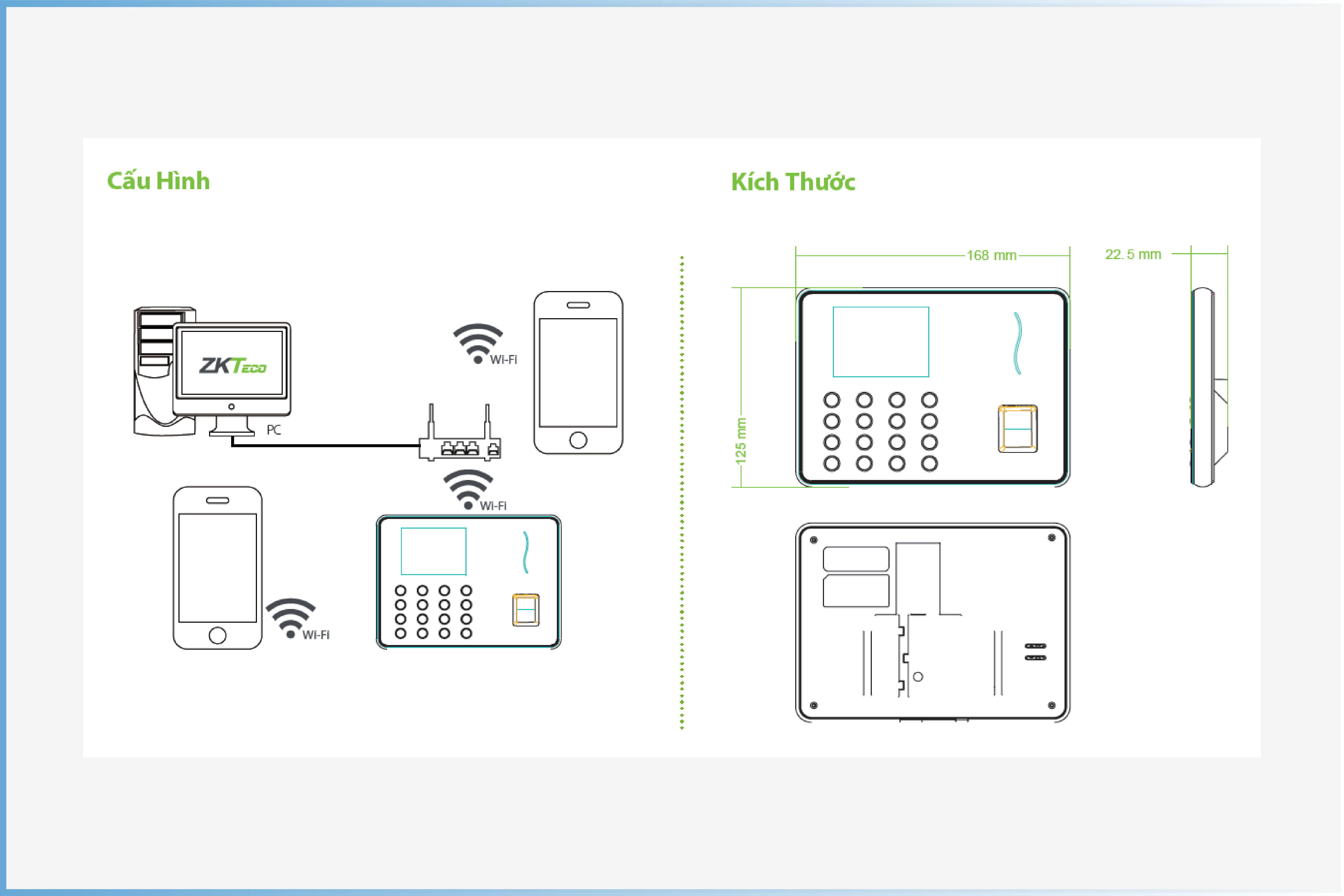 WL10 là thiết bị chấm công vân tay với mô-đun Wi-Fi. Với chức năng Wi-Fi, Người dùng không cần nối dây cáp Ethernet, nó hỗ trợ chế độ điểm phát sóng và cho phép kết nối Ứng dụng di động cũng như kiểm tra vào/ra và tải xuống bản ghi trực tiếp. Được kết hợp với đầu đọc dấu vân tay mới của ZK, hoạt động vẫn ổn định dưới nguồn sáng mạnh và khả năng xác minh ngón tay ướt và thô có độ chính xác cao. Ngoài ra, sản phẩm có thế kế mỏng và trang nhã, phù hợp với các doanh nghiệp có quy mô vừa và nhỏ.
