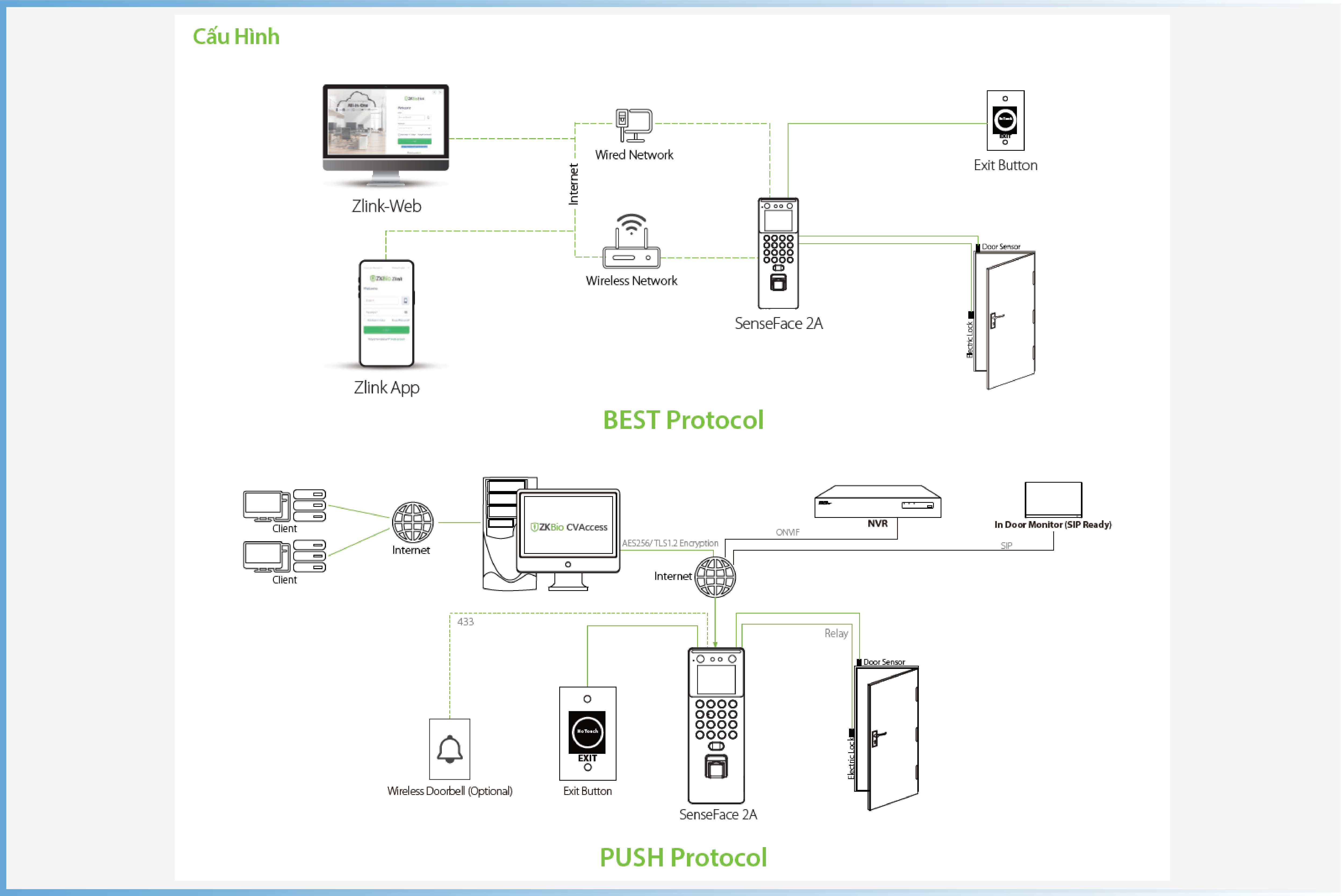 Thêm vào đó, SenseFace 2A còn hỗ trợ nhiều giao thức truyền thông khác nhau. Firmware của thiết bị có thể đẩy AC và chuyển đổi sang đẩy TA, tương thích với nhiều phần mềm AC hoặc TA khác nhau. Hơn nữa, nó cũng có thể chuyển đổi sang giao thức BEST để kết nối với ZKBio Zlink (mô-đun AC).