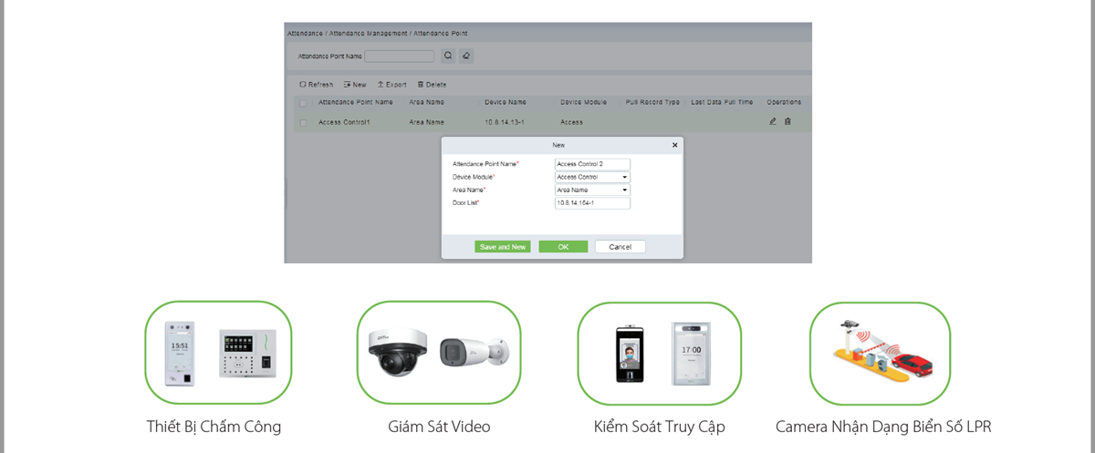 Phần mềm ZKBio CVSecurity hỗ trợ sử dụng dữ liệu kiểm soát truy cập, video và dữ liệu LPR Đ xe để chấm công. Quản trị viên thể thiết lập các điểm chấm công bằng thiết bị chấm công, thiết bị đầu cuối nhận dạng video, thiết bị đầu cuối kiểm soát truy cập và thiết bị đầu cuối LPR.