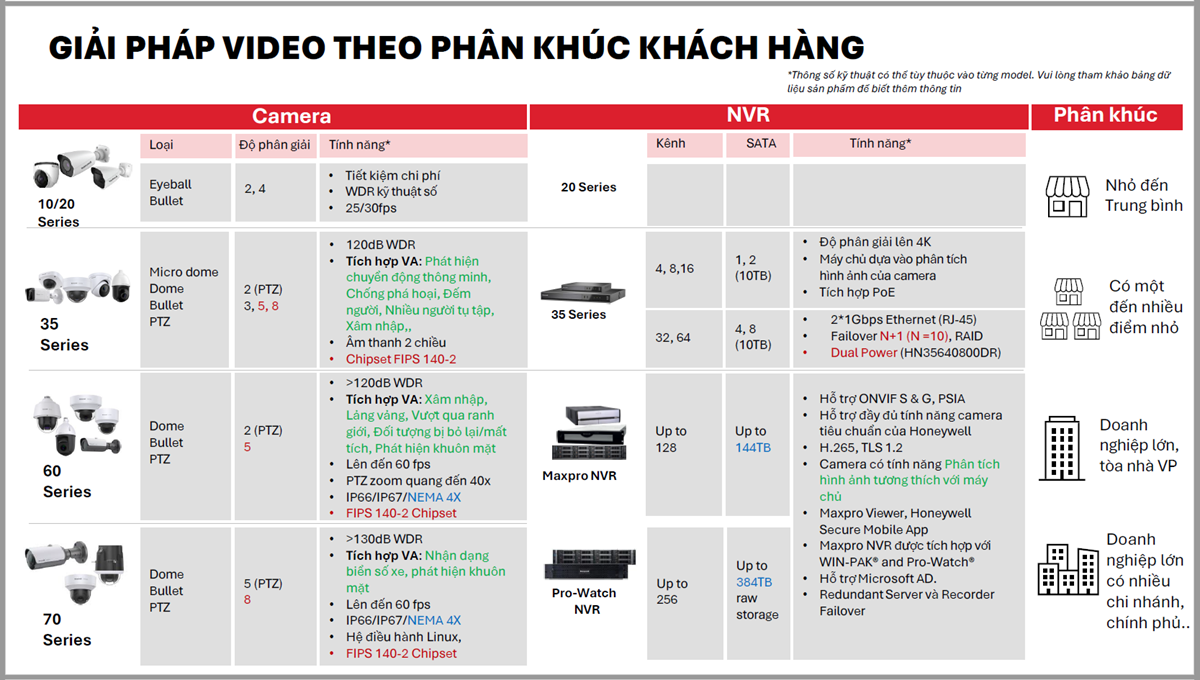 Hình ảnh bên dưới thể hiên định vị giải pháp hệ thống camera giám sát và đầu ghi Honeywell theo phân khúc khách hàng. Tuy nhiên, thông số kỹ thuật có thể tùy thuộc vào từng model. Vui lòng tham khảo bảng dữ liệu sản phẩm để biết thêm thông tin.